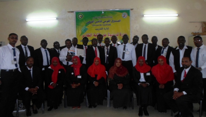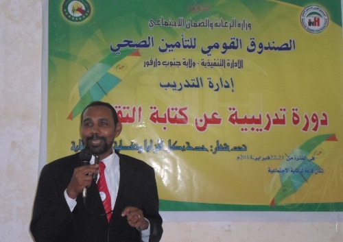 تهدف إلى تدريب الكوادر الوظيفية عقد الصندوق القومي للتأمين الصحي بولاية جنوب دارفور لعدد 25 موظفا و موظفة تدريباً على مهارات إعداد التقارير تحت شعار (خدمة بكل المزايا و تغطية تعم الولاية ) , أقيمت الدورة بمدينه نيالا عاصمة الولاية