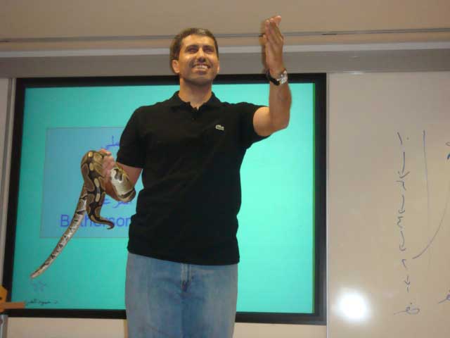 الدكتور حمود العبري أثناء تطبيق تقنية الحرية للتخلص من خوف الثعابين