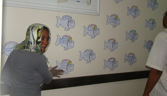 هى عبارة عن لعبة تدريب و تحفيذ المتدرب على التعلم و يستخدم فيها : ورق - اقلام - صور - لاصق . و يتم لصق صور السمك على الحاط مكتوب على كل منها اجابات لاسئلة على ان يكون هنالك اسئلة لها فى اوراق خارجية و يقسم المتدربين الى فريقين و ياخذ كل فريق اسم , و من ثم يرجع كل فريق الى اول القاعة مع العلم بان السمك تم لصقة باخر القاعة لتتم عملية هرولة باختيار احد افراد الفريق لمندوب للذهاب بعد سماع السؤال و لمس السمكة التى تحمل الاجابة الصحيحة و بهذا ياخذ الفريق درجة حتى يتم الانتهاء من جميع الاسئلة .