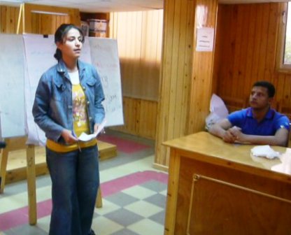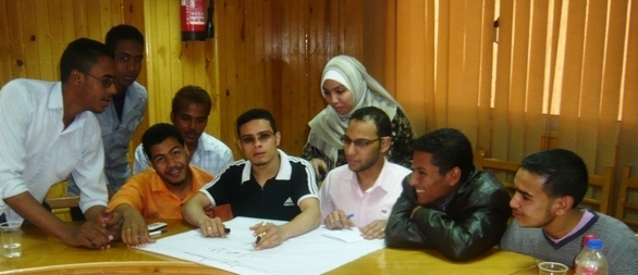 (احد المجموعات أثناء ورشة العمل) وفى اخر ايام الدورة قام المدرب د/ محمد مصطفى بعمل ورش عمل لتطبيق ما عرفوه المتدربين فى الدورة. وقد كانت هذه الورشه عبارة عن تمثيل للادوار بين البائعين والعملاء حيث قسم المتدربون الى ثلاث مجموعات وقامت كل مجموعة بتحديد المنتج الذى سوف تقوم ببيعه للعميل وبعد الاتفاق على الخطة وعملية البيع قام احد افراد المجموعه بتمثيل دور البائع.