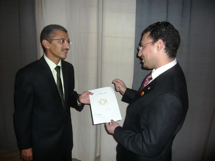 د.تونى بيتر و د. مصطفى الشهير الذى يقدم له لوحة تزكارية مخطوطة باليد من اعمال د. مصطفى