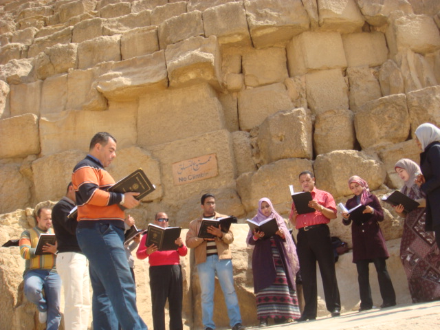 المتدربين يمارسون تمارين الصوت من على سفح الهرم الاكبر لخوفو