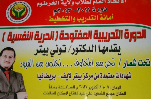 أقيمت بمسرح مجمع الشهيد علي عبد الفتاح لإسكان للطالبات دورة تدريبية عن الحرية النفسية تحت شعار (تحرر من الخوف وتخلص من القيود) قدمها المدرب الاستشاري د. توني بيتر، وكما العهد بهما، حين يجتمع مركز بترلايف للتدريب وتنمية الموارد البشرية والاتحاد العام لطلاب ولاية الخرطوم، وقتها لا يكون المجال فسيحاً الا للنجاح، وأقيمت الدورة على مدار يومين هما الثلاثاء والاربعاء9 - 10 من شهر أكتوبر للعام 2012