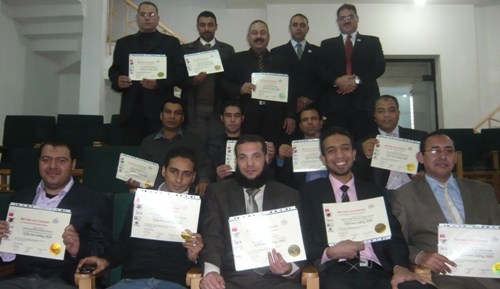 المدرب يتوسط المتدربين في اخر ايام الدورة يعد استلام الشهادات