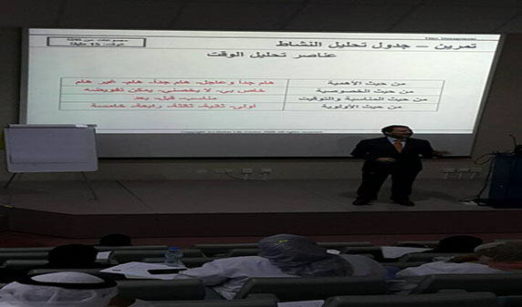 حيث كانت الإستبانات والتمارين العملية المختلفه تظهر لكل منهم موقفة من إدارة الوقت وليتحول المفهوم من إدارة لوقت إلى إستثمار الوقت لان الوقت مورد هام يجب إستثمارة